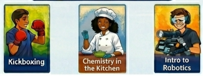 New this year, your child can choose a Major Focus Track! These tracks are a specialized enrichment experience in addition to our already great programming. Your student can choose either Kickboxing, Chemistry in the Kitchen or Robotics. You can make their selection during the registration process. Note, we cannot guarantee that your student will get their first preference as space is limited.